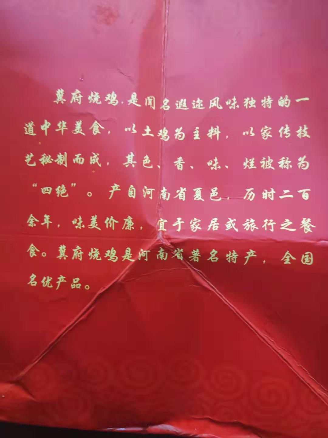 “冀府燒雞”是由河南洛陽冀偉,以祖?zhèn)骷妓嚸刂贫?。該燒雞以當?shù)赝岭u為原料,各種中藥材配料腌制,具有色、香、味、爛“四絕”特色。