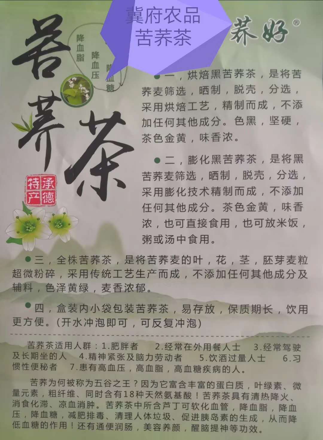藥茶,被稱為第七大茶系。喝茶的同時保健養(yǎng)生已成為時尚,當(dāng)前各種各樣的藥茶應(yīng)運而生。晉商冀家后裔、祖籍山西壽陽的河北承德人冀國興,抓住機遇、開發(fā)生產(chǎn)了“冀府農(nóng)品”系列苦蕎茶。